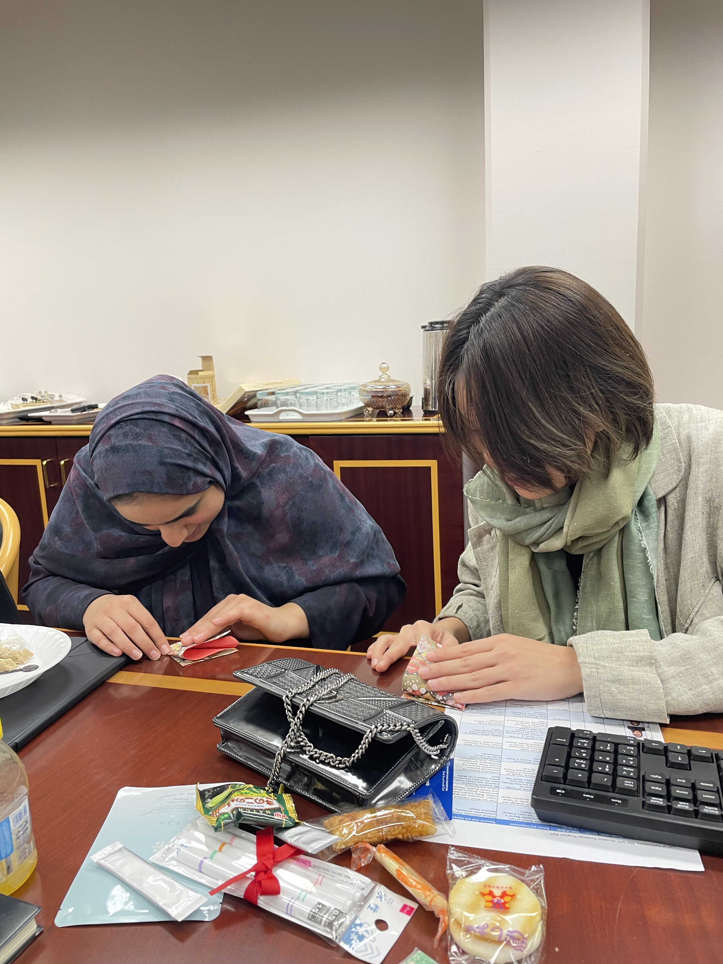 日本人学生がオマーン人学生に折り紙の折り方を教える様子