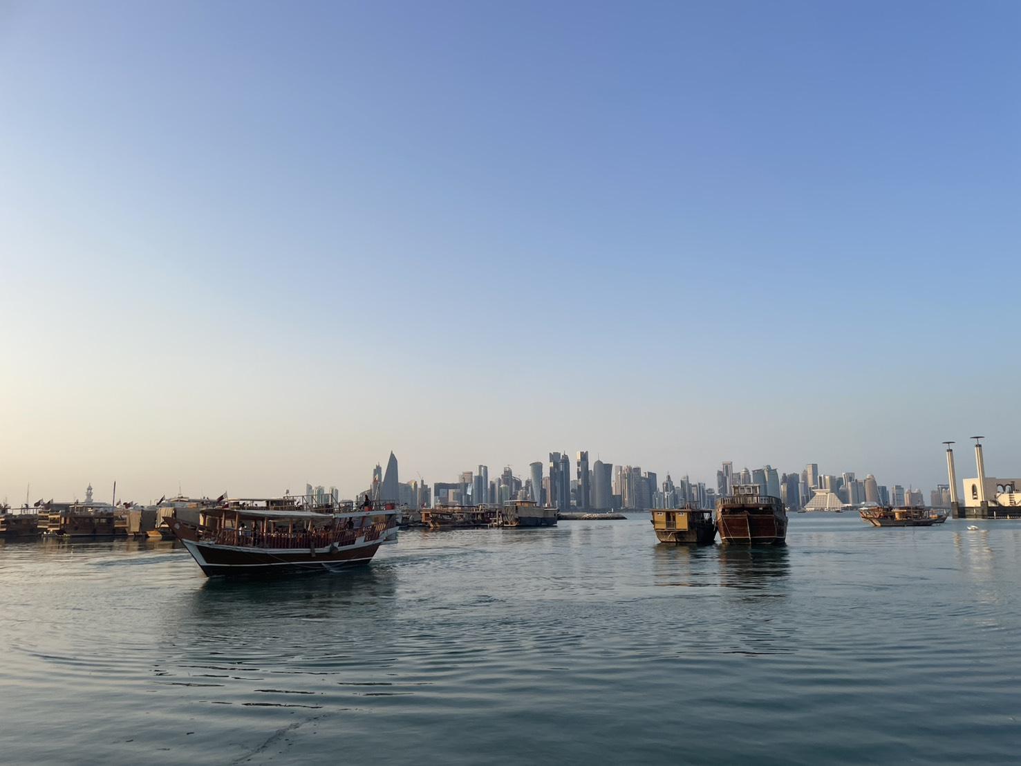 イスラム美術館から海沿いを歩いてスークへ向かう途中、ダウ船が何艘も行き来しているのが見えました。