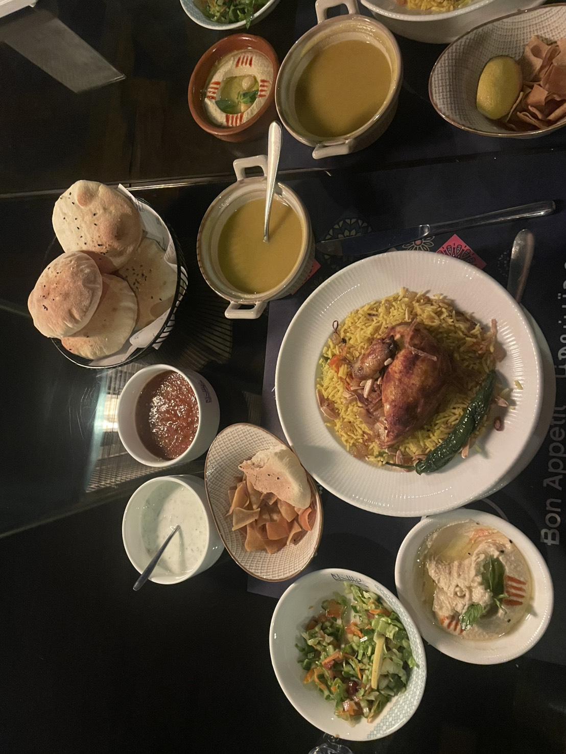 ディナーのコース料理。キャプサと呼ばれるメイン料理をはじめ、ひよこ豆のスープやディップ、サラダやパンをいただきました。