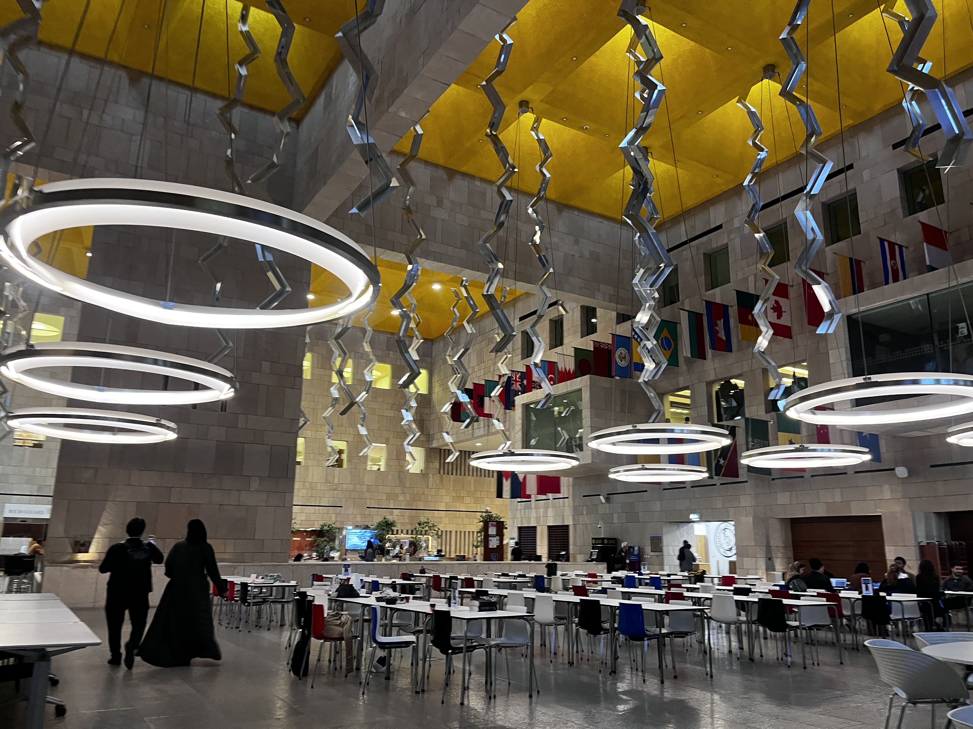 私たちが訪問したGeorgetown University in Qatarは、Education Cityという区画に位置し、他大学や研究機関との近接性、巨大なNational Libraryの恩恵にも預かる研究環境です。吹き抜けの食堂に各国の国旗が掲げられ、スルタン・カブース大学とは一味違う、(当たり前ですが)「西洋的」な雰囲気に満ちていました。Kamrava教授も「この大学においてタブーはなく、政権批判もできる」と紹介していた通り、学問の自由という価値を積極的にアピールしようという気概が伝わってきます。ちなみに World Bankによると、カタールの教育投資は、直近2020年のデータでは政府支出の9.3%、高い時には2008年の15.1%を占めており、構内を案内してくれた学生も奨学金ありきで選りすぐりの学生が集まってくると言っていました。公的資金に支