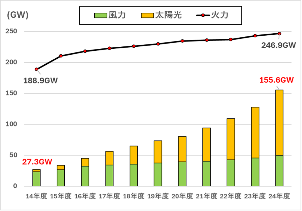 図1:インドの太陽光・風力・火力の発電設備容量(2014年度~2024年度)