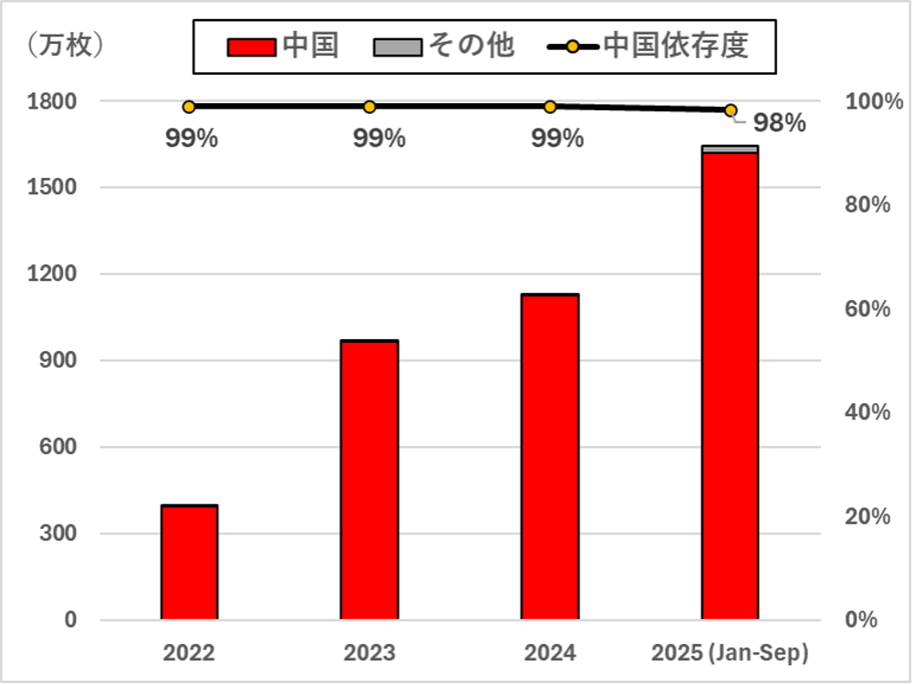 実際、インドが調達する太陽光部品の大半が中国からの輸入品であることは、貿易統計からも確認できる。まず、太陽電池の基盤となるシリコン製の半導体基板「ウエハー(Wafer)」の輸入量は、2022年の約350万枚から2024年には約1,100万枚へと増加し、2025年には9カ月間だけで約1,600万枚以上を記録した。こうした輸入の拡大と並行して、中国からの輸入が全体のほぼ100%を占めており(図2)、インドの中国依存度は極めて高い水準で推移している。