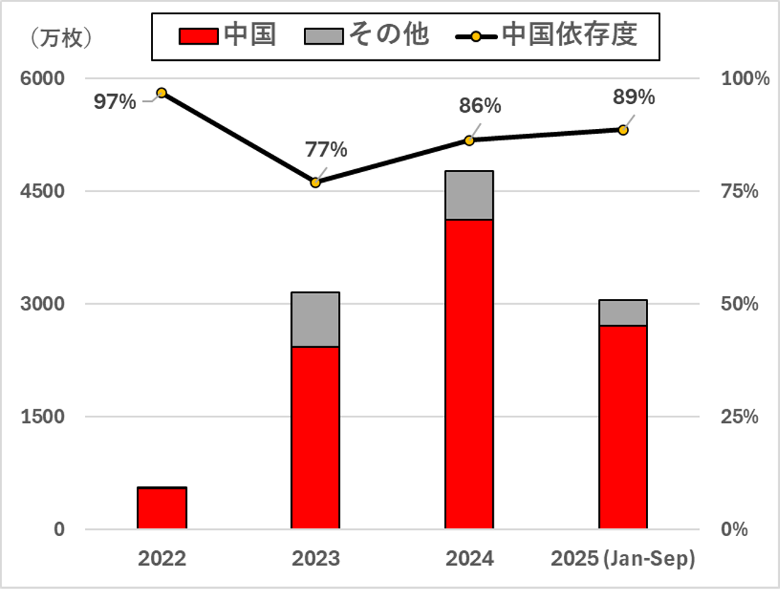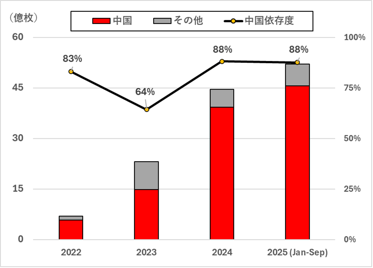 次に、ウエハーの加工を通じて太陽光を電気に変える機能を持たせたセル(Cell)についても、中国からの輸入量は2022年の約6億枚から、2025年1月~9月に約46億枚に増えた結果、中国依存度は9割弱に達している(図3)。