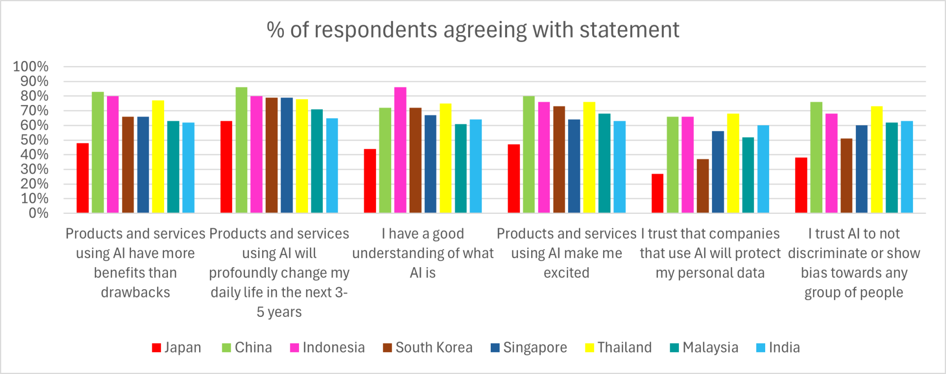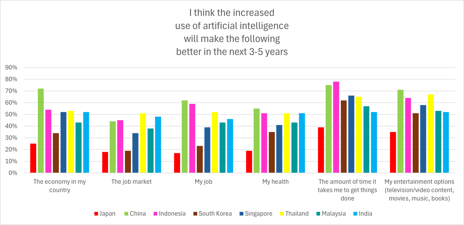Notably, the 2025 results reflect a slight improvement over 2022, when attitudes were even more pessimistic. Japanese respondents also expressed little confidence in AI’s capacity to improve several aspects of their personal lives or society, once again in contrast with more optimistic views in Asian countries like China or, in certain aspects, South Korea (Figure 2).