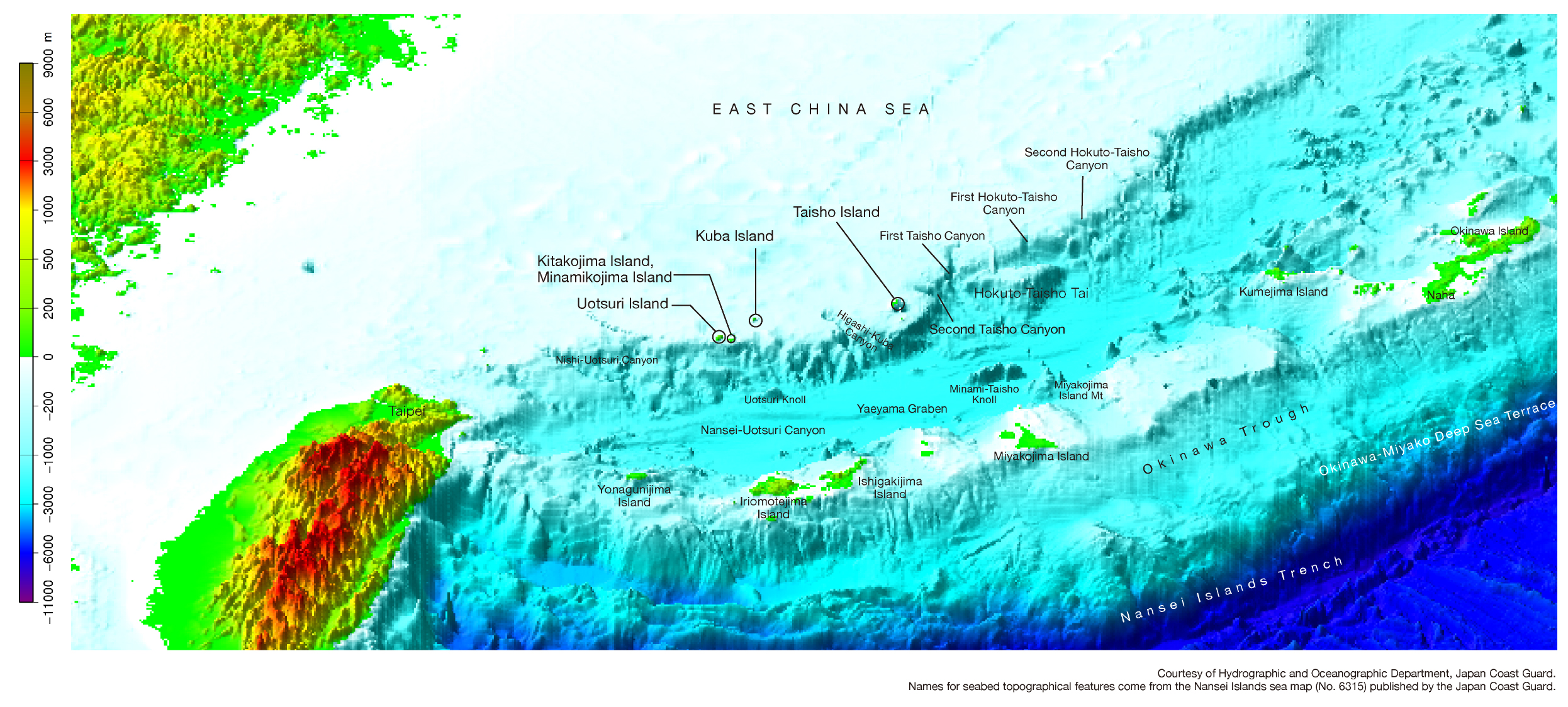 Names for seabed topographical features come from the Nansei Islands sea map (No. 6315) published by the Japan Coast Guard.