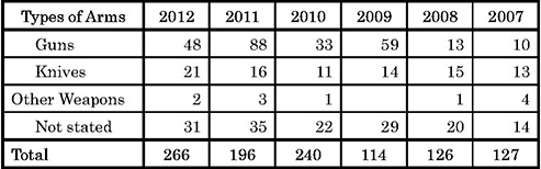 Table 5: Types of arms used during attacks in January − March, 2007 – 2012
