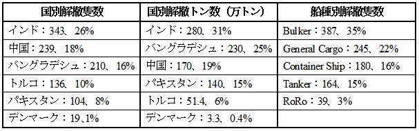 フランスの環境団体、Robin des Boisが1月9日に公表したところによれば、2013年に解撤された船舶は1,119隻であった。この隻数は、2006年に統計をとり始めて以来、2番目に多い年となった。解撤船舶数が最も多かったのはインドで、全体の26%に当たる343隻であった。バングラデシュは3番目に多く、全体の16%に当たる210隻、そしてパキスタンは5番目で、全体の8%に当たる104隻であった。これら南アジア3国で、世界全体の解撤船舶数の50%を占めた。トン数で見れば、南アジア3国が全体の71%を占め、インドが31%に当たる280万トン、バングラデシュが25%で230万トン、パキスタンが15%で140万トンであった。中国は解撤船舶数では2番目で、全体の18%に当たる239隻、トン数では3番目で、全体の19%に当たる170万トンであった。