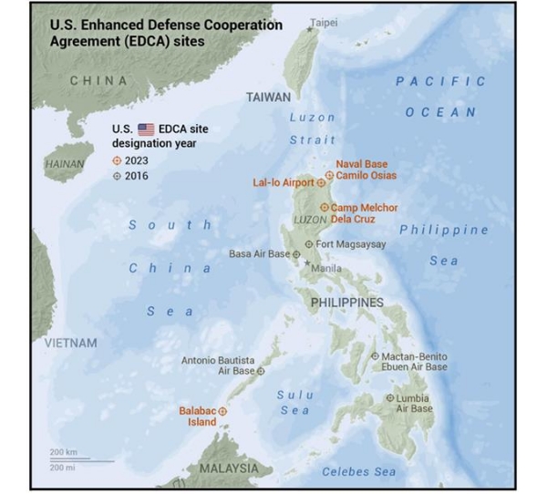 米国防総省は2023年4月、新たに追加されたEDCAサイトの名前を公表した。それによれば、カガヤン州サタアナのカミロ・オシアス海軍基地、イサベラ州ガムのキャンプ・メルチョール・デラ・クルス、パラワン州のバラバック島、カガヤン州ラルローのカガヤン・ノース国際空港(通称:ラルロー空港)の4カ所である。米国防総省によれば、既存の5カ所のサイトに加え、これらの新たなサイトは、米軍とフィリピン軍の相互運用性を強化し、自然災害や人道的災害など、インド太平洋地域における様々な共通の課題に、よりシームレスに対応できるようになる。国防総省は、フィリピン国防省と足並みを揃えて、これらのサイトでの近代化プロジェクトを迅速に推進する。そのため、既存のEDCAサイトへのインフラ投資額、8,200万ドルに加えて、2024年4月には、9カ所のサイト全てに1億2,800万ドルに投資を拡大する計画である。[33]