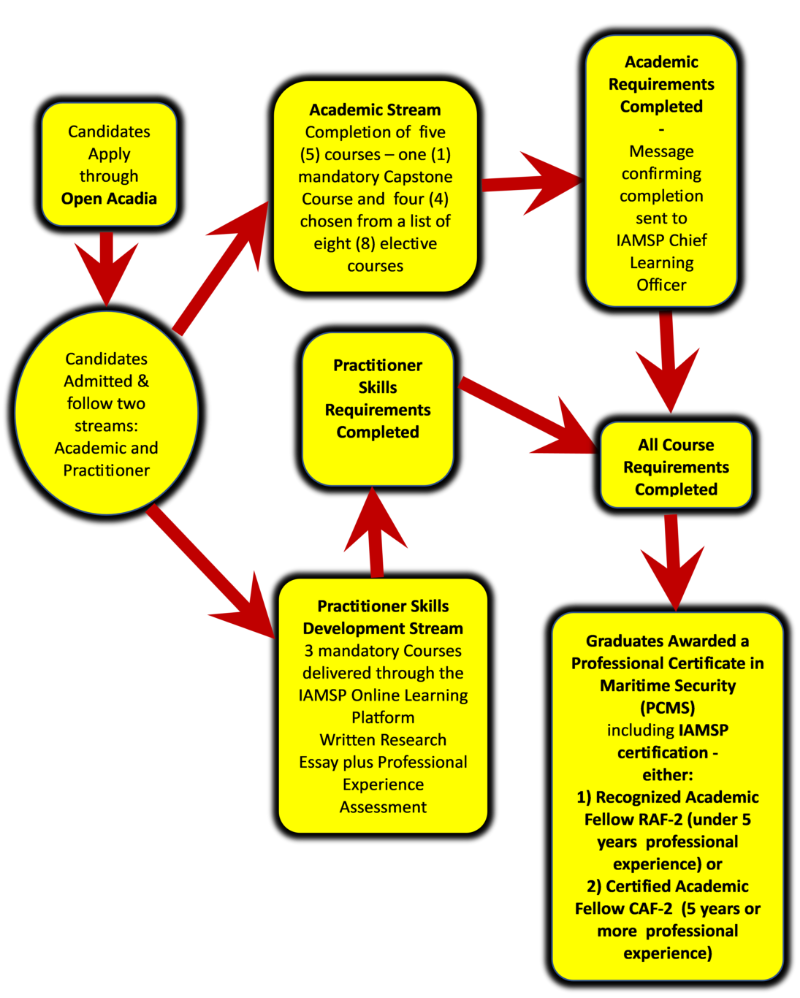 In addition to the professional certificate from Acadia University, successful graduates with working experience receive IAMSP accreditation. The program is intended to instill in employers a greater sense of confidence that those who have completed it are more capable of successfully meeting the challenges faced in maritime security. The PCMS program is the first of its kind to take this holistic and comprehensive approach to maritime security education and training. This globally unique program is fully online and designed for working professionals in any field of maritime security and located anywhere in the world to take the program at their own pace.