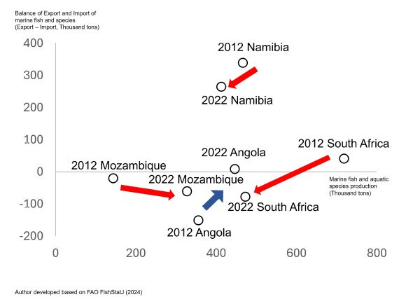 ■Figure 2: Changes in Fishery Production and Trade Balance of Southern African Countries (2012-2022)