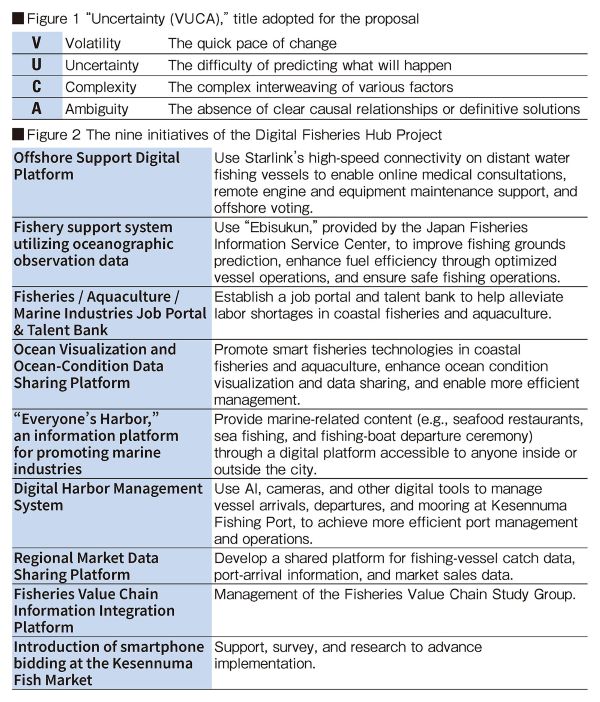 Amid these circumstances, Kesennuma City applied for the national program to designate “digital fisheries strategy centers” and was selected in August 2023 alongside Senshu, Osaka and Shimonoseki. The title of its proposal was “Challenging Uncertainty (VUCA)” (Figure 1).