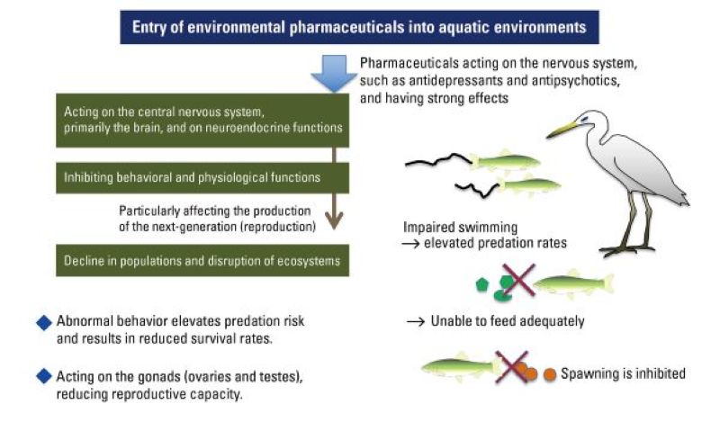 We use many pharmaceuticals in our daily lives. These pharmaceuticals are released into aquatic environments through sewage treatment plants, and it is becoming increasingly clear that they affect the organisms living there. In particular, pharmaceuticals that act on the nervous system can cause abnormalities in fish behavior and reproduction. Because pharmaceuticals are essential for maintaining human health, it is necessary to correctly understand their biological effects and consider how we can coexist with them.