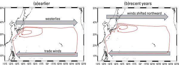Comparison between (a) earlier and (b) recent years. The thick gray arrows represent the winds, and the clockwise red arrows indicate the subtropical ocean circulation. The triple red arrows indicate the strength of the Kuroshio flow in the western part of the subtropical circulation. Compared with earlier conditions, this strong Kuroshio flow has shifted northward in recent years.