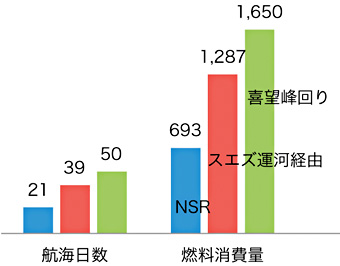 ■NSR通航による航海日数と燃料消費量(トン)節減効果例