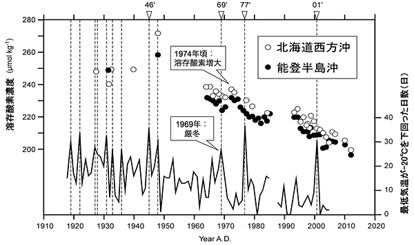 もしこれを酸素消費が増加したことで説明するならば、海水中の有機物量も増加したことになる。しかしながら、少なくとも1960年代以降とそれ以前で表層のクロロフィル濃度に大きな変動は見られないため、有機物量が急激に増加したと考えるには無理があるだろう。図2中に示した実線は、日本海北西部沿岸に位置するウラジオストク市の冬季(12月〜2月)の最低気温が-20℃を下回った日数の積算値を示している。点線は積算日数が25日を越えた年(これを厳冬年とする)を示しており、1950年以前は数年に1度の頻度だったものが1960年代以降はわずか3回に留まっている。つまり、深海の酸素減少傾向は1960年代以降の北西部海域における冬季の海面冷却の低下に伴う深海への酸素供給量の減少が原因であることが推測される。地球温暖化の影響で底層水形成が抑制され、その結果として酸素が減り続けているのである。