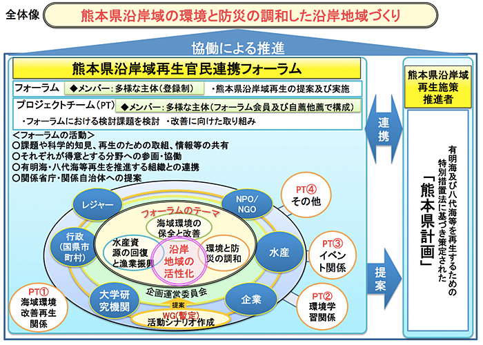 本フォーラムの全体概要は図に示すように、沿岸海域に関わるすべての関係者が集い「海域環境の保全と改善」「水産資源の回復と漁業振興」「環境と防災の調和」の3つを基本として「沿岸地域の活性化」を図ることをテーマに掲げ、各テーマに関わる具体的な計画と実施を行うプロジェクトチーム(PT)を設置し活動を推進します。本フォーラムは沿岸地域づくりに関する自主活動とともに熊本県沿岸域再生施策推進者(熊本県、市町村、国、漁業関連機関等)への提言や連携を行います。国の行政レベルの有明海・八代海再生の特別措置法に対し、地元住民・地元行政が連携して具体策を提言し、実施を行うものです。