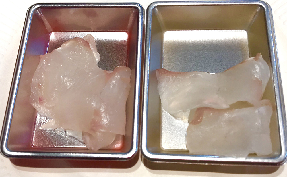 千葉外房で獲れたヒラメ。今朝〆たもの(左)と3日前に〆たもの(右)を見比べて試食する。今朝のものは歯ごたえがよく見た目もぷりぷりしているが、味わいは3日前のもののほうがある。講座内容は、築地市場仲卸の方々にすべておまかせでお願いいたしました。