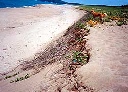 塩屋・片野海岸は、海浜植物におおわれた砂浜が続く美しい海岸だった。ここでは漂着油と砂を重機で混ぜたために、膨大な量の重油含砂の処分ができず、そのほとんどを海岸に穴を掘って埋めてしまった。そのため砂浜を抑えていたコウボウムギ、ハマゴウなどの海浜植物の根が、油や回収作業の影響で枯れてしまい、特に塩屋海岸では、長さ100m弱、高い所で3mほどの浜がけができ、海岸が侵食されつつあった。砂浜の表面には、埋められたお餅のように柔らかな重油含砂が、散乱するゴミの間から点々と顔を出していた。時化ると油は海へと流出していった。