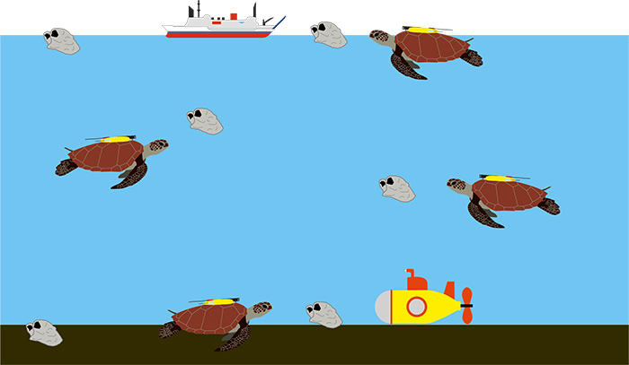 ウミガメ類にバイオロギング装置(主にカメラ)を装着することで、水面、水中、海底に分布する海洋ごみを鉛直的に観測できる。