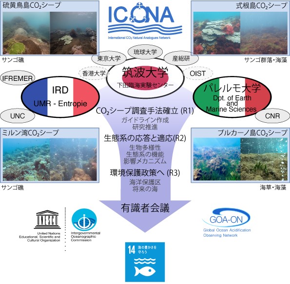 CO2シープなどの自然の高CO2環境を利用したアプローチは、海洋酸性化に関する重要研究課題とされている。その一方で、CO2噴出部を操作することができないため、対象とする生態系の選択はCO2噴出海域周辺に限定される。そのため、1か所のCO2シープで展開できる研究の範囲は限定的であり、異なるタイプの生態系の将来予測を行うためには、複数のCO2シープを利用したマルチシープ研究が不可欠である。そこで2021年4月より、「自然の海洋酸性化生態系をつなぐ国際研究拠点」(ICONA: International CO2 and Natural Analogues Network)が(独)日本学術振興会の支援の基で発足した。これは、筑波大学下田臨海実験センター、東京大学、琉球大学、(国研)産業技術総合研究所、沖縄科学技術大学院大学などが国内拠点、イタリアのパレルモ大学やフランスの国立開発研究所が海外拠点として連携する国際ネットワークプロジェクトである。このネットワークでは、世界各地のCO2シープ研究者らが協力し、研究サイトを相互に利用しあうことで多様な研究アプローチを異なるCO2シープ周辺の生態系に展開していくことが期待される(図)。