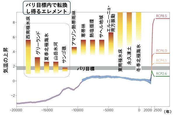 Schellnhuberら(2016)Why the right climate target was agreed in Paris. Nature Climate Change. Vol.6および環境省資料を基に著者和訳。RCPは排出シナリオ。