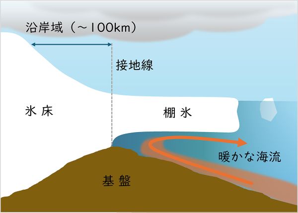 ■図1 棚氷と接地線付近の模式図。暖水による融解は接地線後退を引き起こし、基盤地形によっては氷床の安定性に大きく影響する。その理解には基盤地形の詳細把握が重要である。