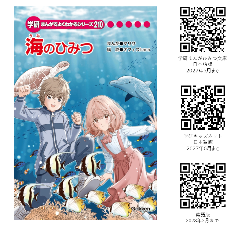 国民の「海離れ」が進む中、多くの小学生とその保護者・教育現場の方々に海洋に関心を持ってもらいたいという思いから、日本財団の助成事業「海洋教育パイオニアスクール事業」の一環として実施されました。冒険調の展開の中で、海のさまざまな現象や環境問題を織り込みながら、海と人が共に影響しあい繋がっていることを分かりやすく伝えるよう心掛けました。本書印刷版(非売品)は、Gakkenを通じて全国の小学校(特別支援学校含む)、公立図書館、児童館等に合計25,000部が寄贈されました。デジタル版は、期間限定で「学研まんがひみつ文庫」や「学研キッズネット」にて無料で公開されています。