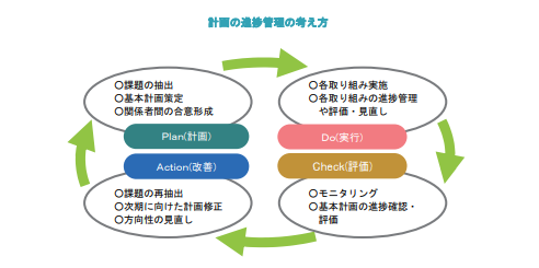 事業内容によっては、次の事業実施と同時並行的に計画策定が進む場合もあるが、事業実施計画をまず作成し、PDCAサイクルにより実施し、事業評価を経て計画の修正を行うプロセスを経ることが望ましいと考える。