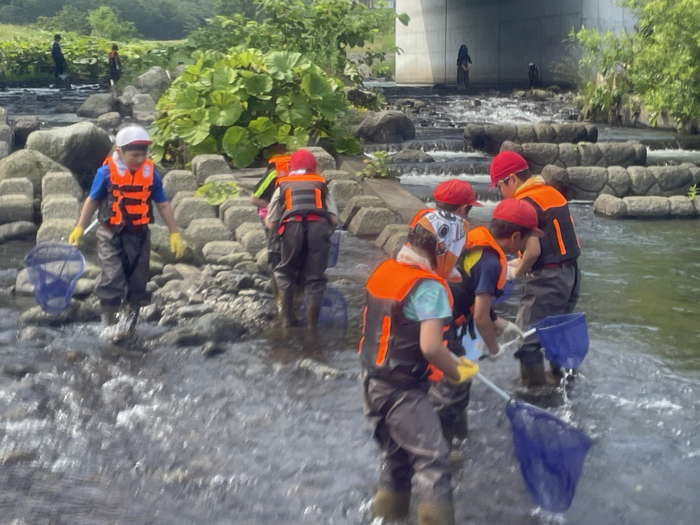 国語「さけがおおきくなるまで」と関連付けながら漁業関係者の協力を得て、サケの稚魚の餌まき体験や放流体験を通して豊かな海を持続する大切さについて学ぶ活動を実施した。