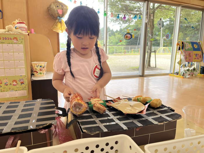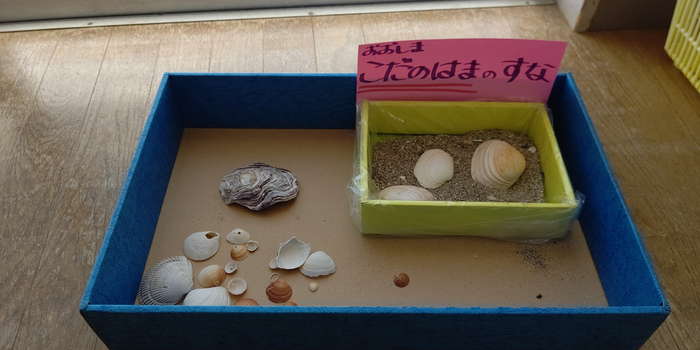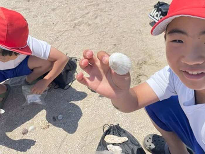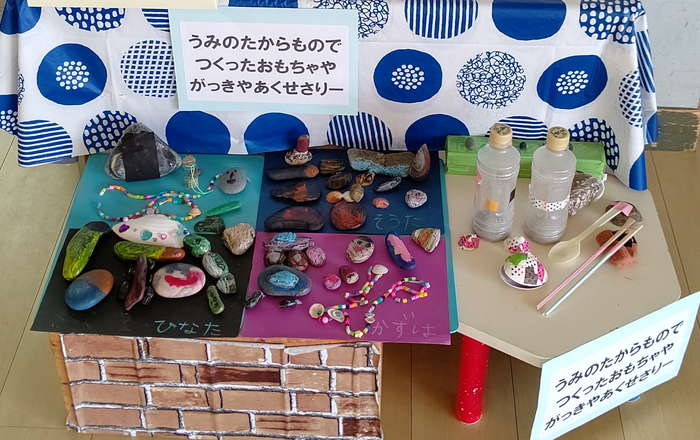 どの海を訪ねても必ず行うのが,ビーチコーミング。今までの経験の積み重ねから自然と拾い集めてしまっている。初めは「たからものだから,おうちにもってかえる」とそのままお土産として持ち帰っていたが,そのうち「〇〇のかたちににているね」「いろをぬったらいいんじゃない?」と何かに変身させてみようというアイディアが生まれた。石にもいろいろな形や模様があり,組み合わせると何かの形になることに気付き,さらに小田の浜で見つけた貝には穴が開いていて,アクセサリーにできるという。そんなアイディアから夏まつりでは、家族と一緒に海で拾ってきた宝物を材料にワークショップを開き,楽器やアクセサリーを作って楽しむことができた。また,一緒に交流した中学生にはサンドソルトアートを,他園の友達には海の素材を閉じ込めたキーホルダーをプレゼントし,うみのたからものを使いたくさんの作品が出来上がった。自分たちが拾い集めた宝物でたくさんの人たちに喜んでもらえたことで自信につながり,「うみってサイコーだね!」と思える経験をたくさん味わえたと感じた。