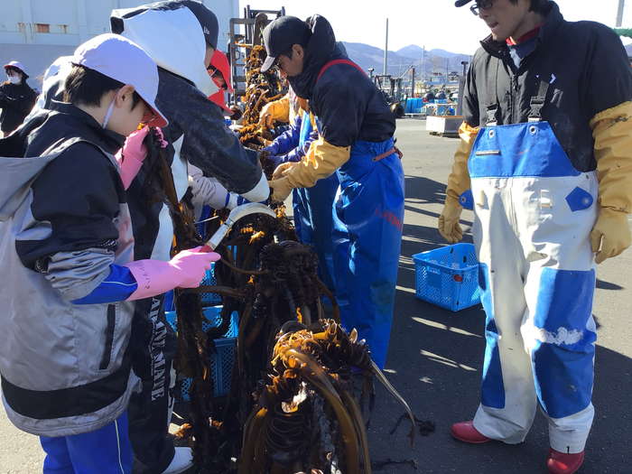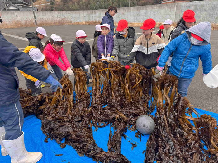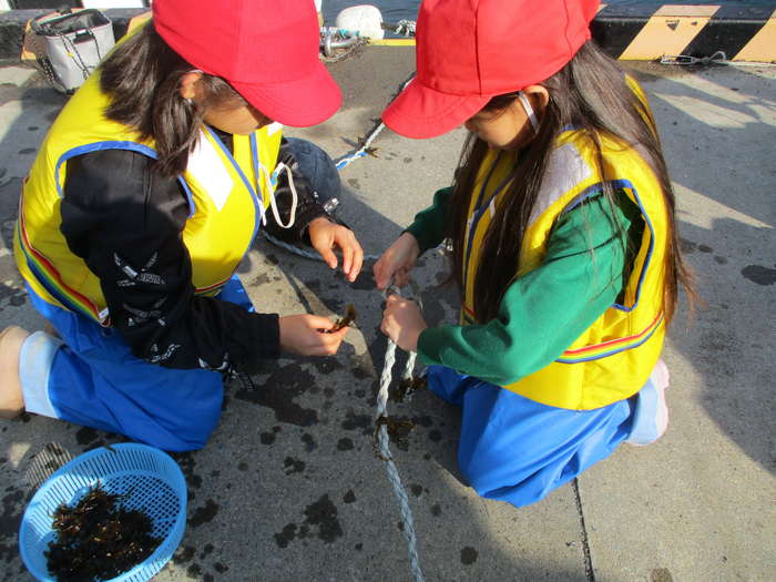 ・5年生は、階上漁協青年部の協力によるわかめ養殖体験を行った。地元の食材と環境とのつながりについて持続可能な水産業にしていくために必要なことは何かなどについて探究活動を行った。また、現在階上の海で起きている問題(海洋ゴミや海水温の上昇など)を知り、それに対して自分たちができることは何かを考えることができた。社会科で学習した水産業の後継者不足の課題と関連させて、気仙沼向洋高等学校の海洋類型の生徒と交流をした。漁業の技術を体験したり、水産業に関わる職業を目指すことになったきっかけを教わったりした。海への思いや考えをより深めることができた。海洋教育子どもサミットで気仙沼の水産業について発表し、現在の海の問題について学んだことを発信した。
