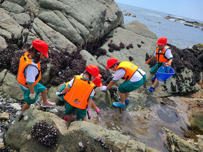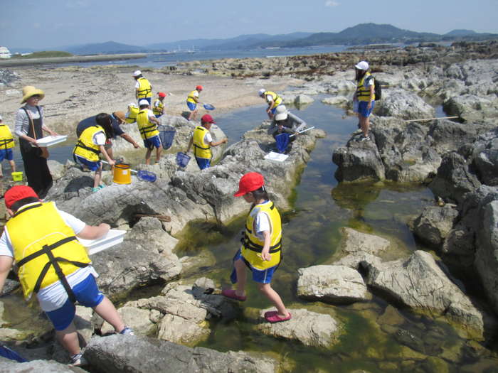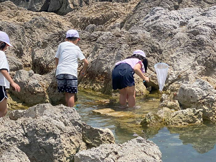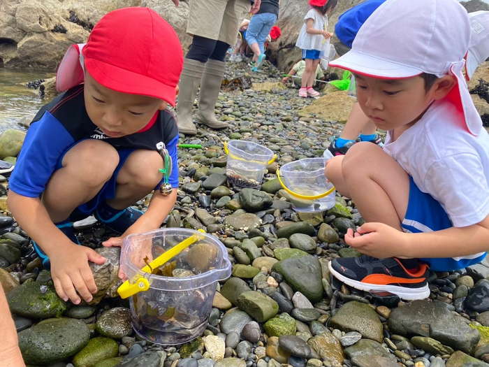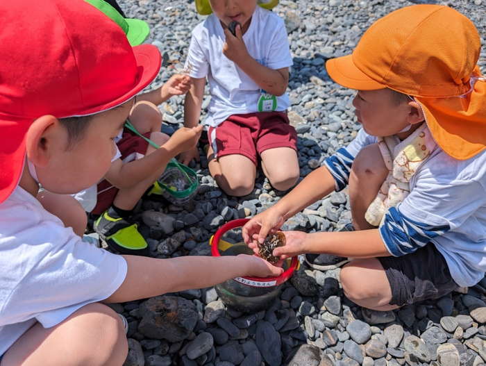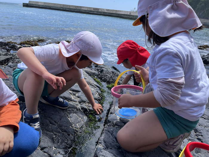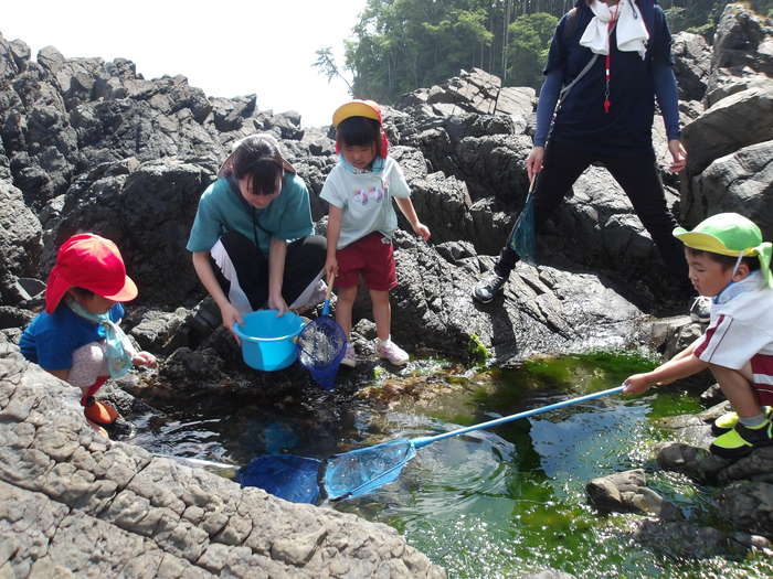 5月に近くの滝浜へ散策に出かけた。何度か遊びに行ったことはあったが,潮が引いて潮だまりがたくさんできる岩の上を散策するのは初めてであった。恐る恐る岩山を渡り歩き石の下や潮だまりにカニや魚を発見すると大きな声でみんなに知らせて大喜びする姿が見られた。見つけた貝殻や生き物は各家庭に持ち帰ったり,園の活動に使ったりした。生き物は毎日潮水を変えないと生きられないことを伝え,家族と相談してほしいと話すとほとんどの家庭が海に逃がしたといい,海の生き物を飼育する難しさを感じることができたのではないかと思う。何度も訪れた浜であっても,こんなにたくさんの海の生き物に出会う機会はなく,画像に収めたり,持ち帰ったりして図鑑で名前を調べた。身近な海にもたくさんの生き物がいることを知り,海での遊びも広がり,海に対する興味が大きく高まっているのを感じた。