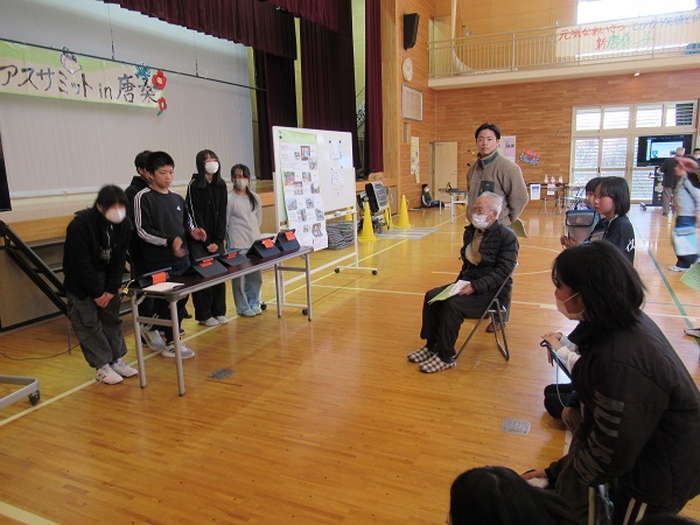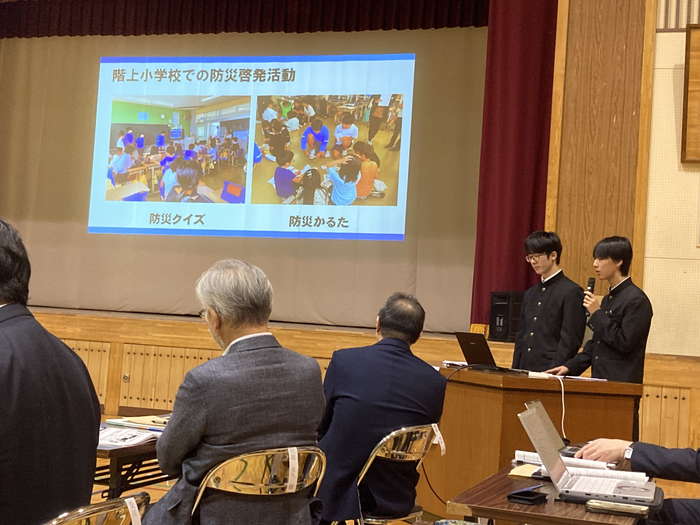 ・4年生は、地域の総合防災訓練時に各グループが作成した防災マップを発表し、地域の危険箇所等について地域住民に伝えた。また、地域住民の視点で気付いたことを教えてもらい、防災マップを改善することで双方向で防災意識を高めた。