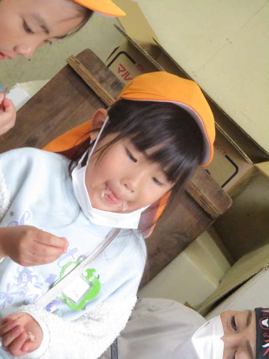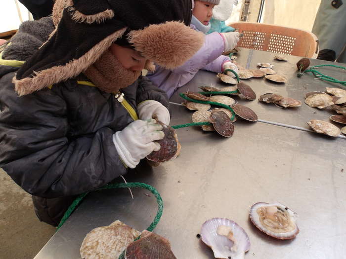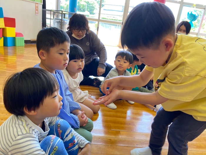 春に散策に行った滝浜や1回目のなかよしうみっこだんで行った馬場の浜は石がゴロゴロ大きくて歩きづらかった。アワビの貝殻やウニの殻などが落ちていた。それに対し,春の親子遠足で訪れた大島の小田の浜や隣の田中浜は砂浜でサラサラした感触をしており,海辺に落ちている貝殻は小さくてきれいだった。その中に穴の開いた貝殻をいくつも見つけ,持ち帰ってから「穴の謎」についてみんなで話し合ったり図鑑で調べてみたりしたが解決しなかった。家族に聞いてみることをミッションとして与え,いろいろな意見が出た。その中でインターネットで調べてくれた家庭から,ある貝が他の貝に穴をあけて中身を吸い取ってしまうからだと答えを出してくれた。実際ネットで調べて画像を確認すると,自分たちが拾ってきた貝殻の中に犯人の貝殻を発見した。幼児たちは驚きながらも,みんなにも教えてあげたいという気持ちが高まり,集会の時に「おしらせ」の時間を使い発表することにした。自分たちから湧き出た疑問から調べ活動を行い,答えを見つけられた達成感や充実感を感じることができていた。その後も,疑問に思ったことを図鑑やネットで調べてみようとする探求心が芽生えた。