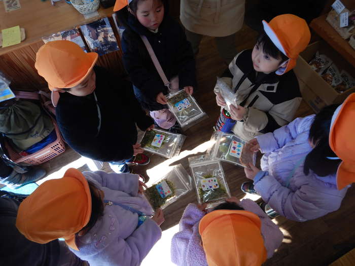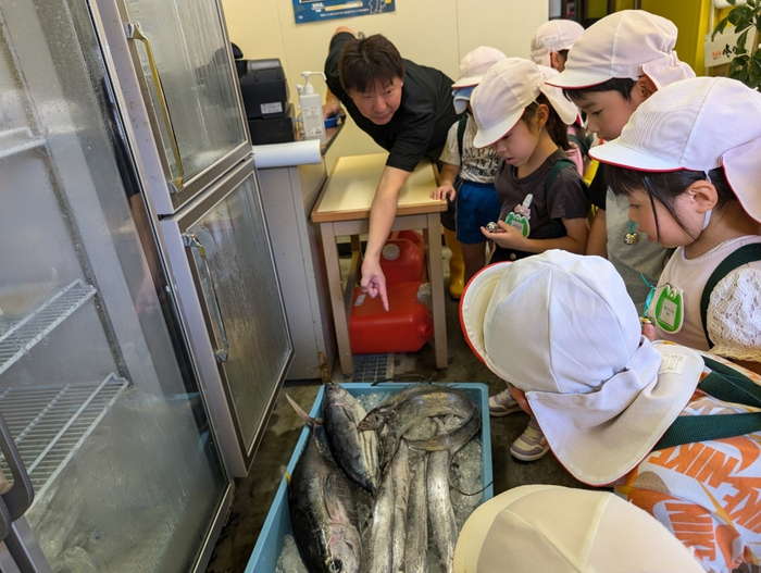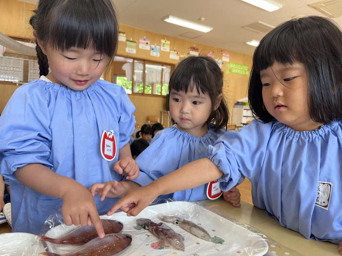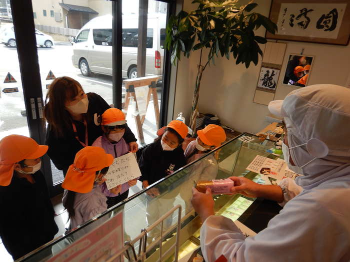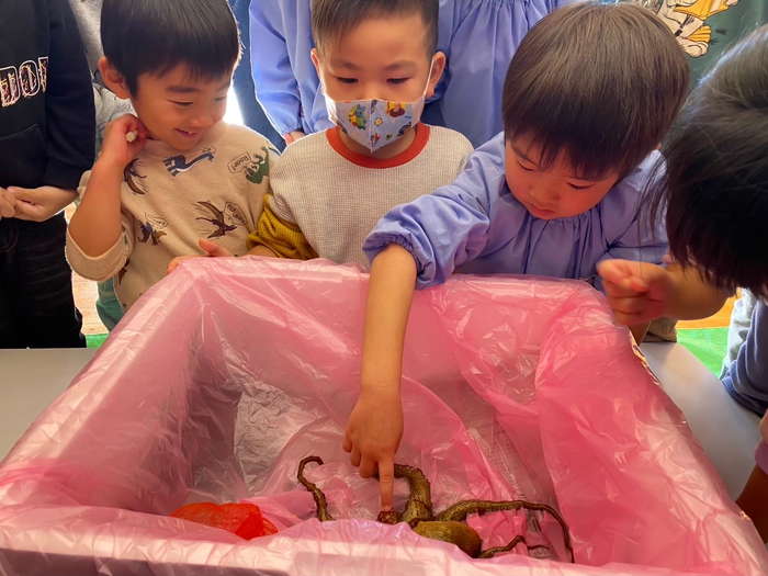 今年度も「にこにこ散歩」を通して,近隣の商店街で働く人と出会い,様々な店舗の商品や仕事内容に興味をもち,お店の人への親しみを深めていった。中でも,地元の鮮魚店との関わりは,海の生き物や海の仕事をする人に興味や憧れの気持ちをもつ体験となり,その後の海の活動を広げていく足掛かりとなった。