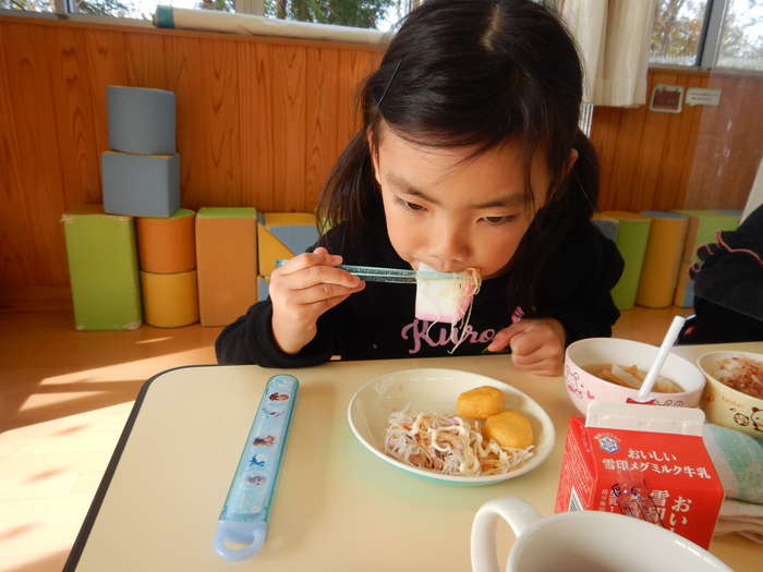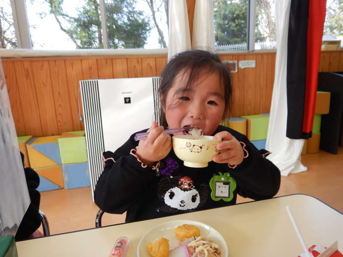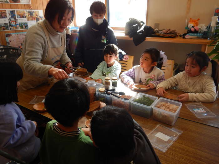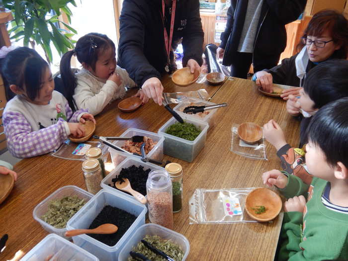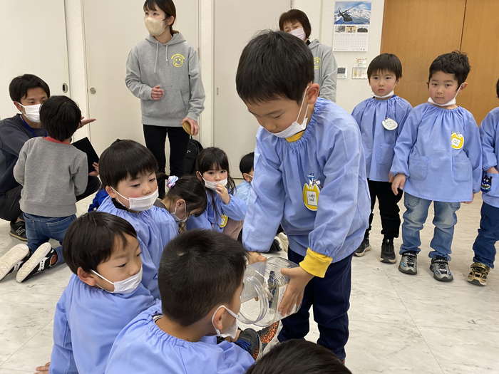 1月には,『海洋おもいで交流会』として,公立幼稚園5園の全園児が集まり,交流会を行った。年長児は,うみっこだんの活動を中心に1年の振り返りを,年中児は他園の友達と出会い,各園の海の活動を紹介しながら来年度への期待を膨らませ,年少児は他園の友達と出会い,ふれあいを楽しんだ。年齢別に遊んだり,全員でご飯を食べたりする時間を設け,「海が大好き」な友達と一緒に楽しい時間を過ごしたことで,またいつか一緒に交流できることを楽しみにすることができた。
