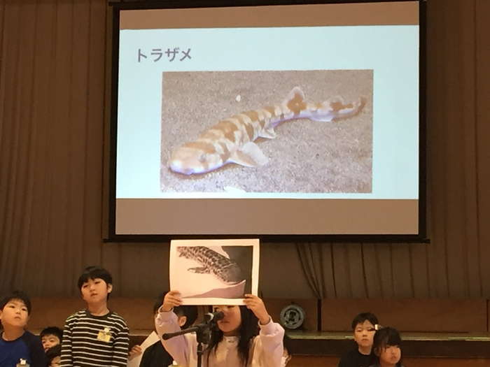 サメをテーマにして学習している3年生では,サメについて調べたり,施設の見学をしたりすることを通して,地域の産業への興味・関心を高め,地域の方の思いに触れながら海の資源活用への思いを育むことができた。