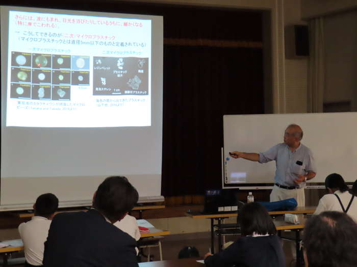 「海洋ごみについて」 下関水産大学、柏野教授による海洋ごみについての講演を聞き、自分で調べたいことを見つけ、それについて探求していくことで、海を大切にする心情や態度を育む。