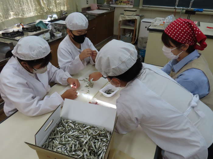 〇「いりこを使った商品開発」 いりこを使った新商品を開発する活動を通して、浮島のよさを理解するとともに、それを内外に広めることで、浮島を愛する心情を養うとともに、将来を生きるマネジメント力を育成する。町健康増進課との連携 保護者や地域による評価。