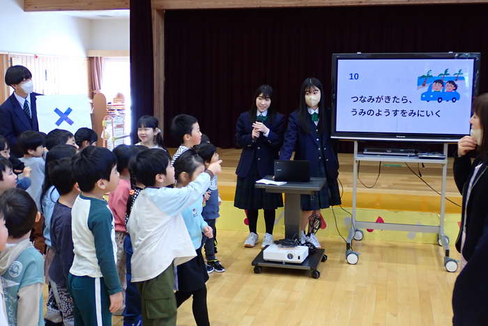 地域の自然環境を学び、起こりうる自然災害を想定し、地震・津波等の知識を得た高校生が地域のこども園~小学校~中学校へ出前授業として地域へ伝える活動である。本校では、この学びを「地域循環型防災教育」として、町役場と連携し実践し、町報等を通して町民へ発信している。海洋からの生態系サービスを学習した生徒から海洋がもたらす脅威を伝えることでさらに学習効果が高まる活動である。