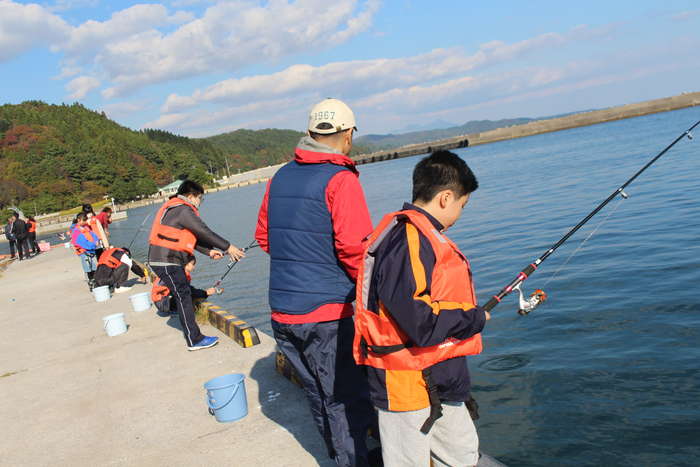 脇野沢の海にいる魚を実際に確かめるために、近くの漁港で釣りをした。サビキ釣りで、ウグイ、サバ、フグなどが釣れた。