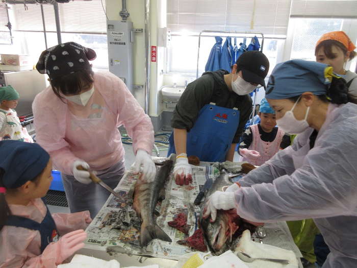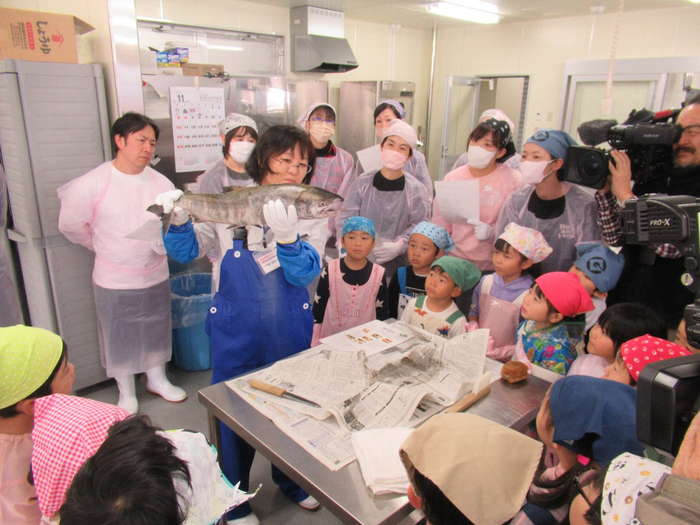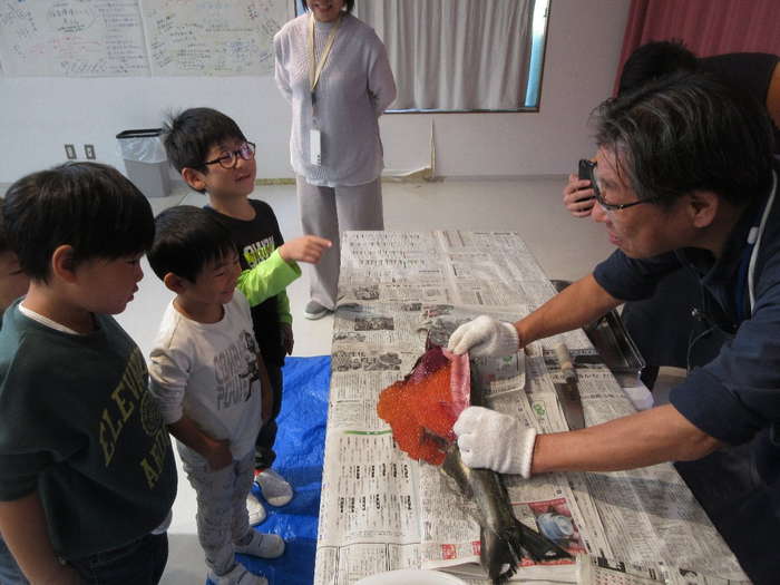 ・釜石で捕れたメスのサケを魚食普及コーディネーター清原拓磨氏が子どもたちの前でさばいて見せる。