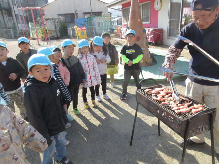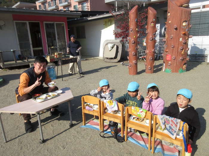 ・さばいたサケを園庭で炭火焼きにし、命に感謝してみんなでおいしくいただく。