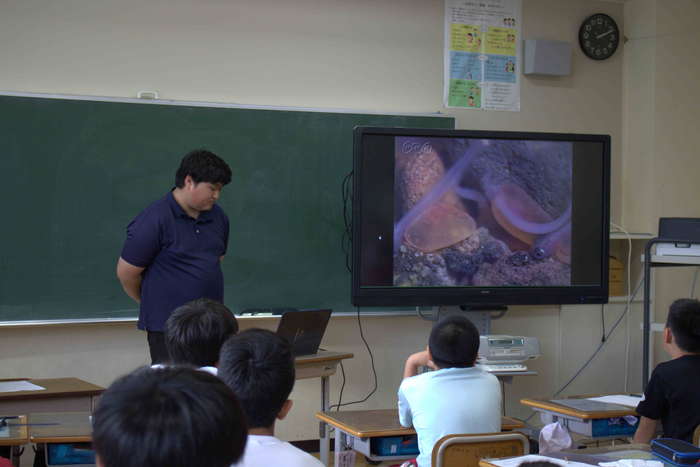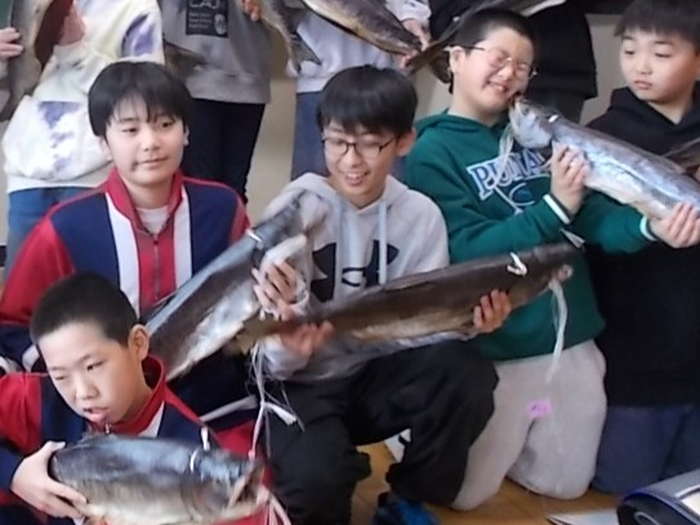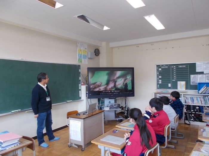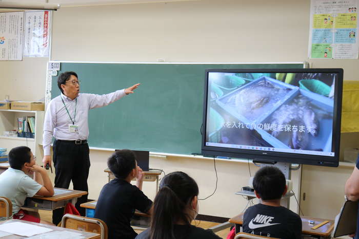 田村直司氏(岩手大学産学官連携専門員)、三谷守氏(岩手大学大学院生)を招聘し、サケの学習会を行った。最初に三谷氏から、「サケの一生」という演題で、サケの産卵や孵化から成魚として戻ってくるまでの回遊ルート、母川回帰の習性について説明を受けた。次に田村氏から「サケを獲る定置網と流通」という演題で、釜石湾での定置網の仕掛けの映像をもとに、定置網に魚が入る仕組みや採捕した魚が市場に運ばれるまでの様子について学んだ。児童は、サケが産まれた川に戻ることができる理由や、サケの回帰率の低さに驚きを感じ、身近な魚であるサケについて学びを深めることができた。