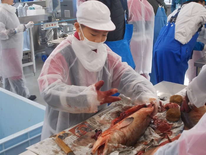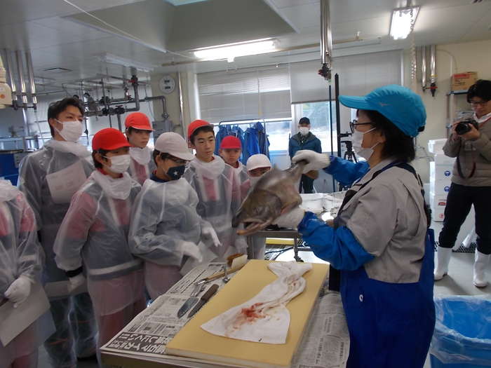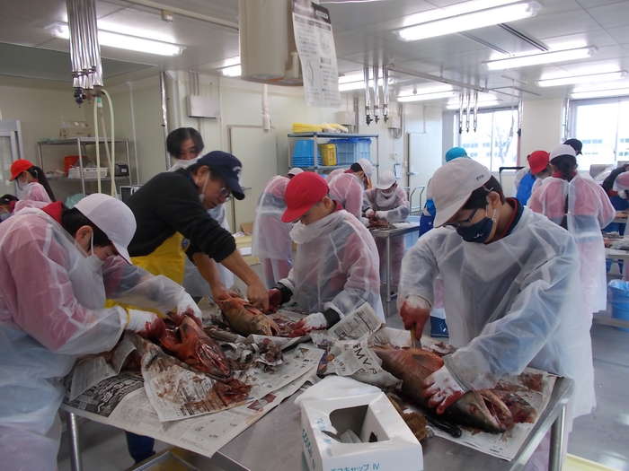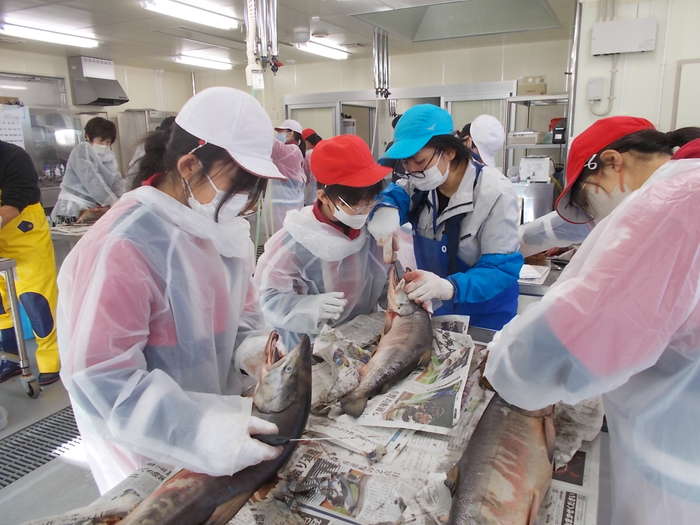 宮田小百合氏(岩手県水産技術センター職員)に依頼し、新巻きザケづくり体験を行った。最初に宮田氏による説明と実演により作業内容を確認し、(1)ぬめりとり、えら・内臓の除去(2)血合いの除去と洗浄(3)施塩(4)漬け込みの順で作業を行った。その後、齊藤孝信氏(岩手大学釜石キャンパス特任専門職員)による説明を受けた。温暖化の影響で県内産のサケの入手が困難であること、地域に古くから伝わる新巻きザケづくりは、先人たちの知恵により受け継がれてきたものであることを知り、サケの回帰率と環境との関わりや地域文化の継承という観点から貴重な体験となった。
