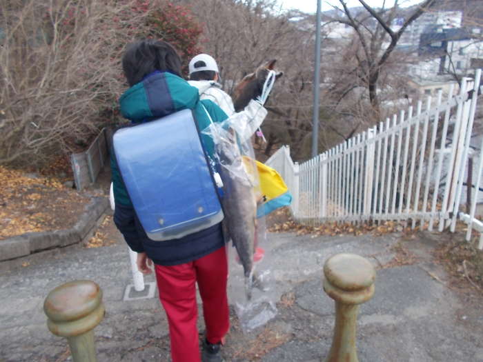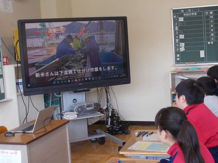 齊藤孝信氏(岩手大学釜石キャンパス特任専門職員)を招聘し、「サケの流通」をテーマに、定置網によるサケ漁の様子について前々回の動画を基に、確認した。その後、齊藤氏が11月に撮影した釜石魚市場の水揚げ及び競りの様子を動画で視聴した。競りや魚の流通の仕組みについての説明に加え、海水温上昇による魚種の変化に触れ、従来釜石の近海では獲れない魚が網にかかることが多くなっているが、見慣れない魚のため食卓に上ることもなく未利用魚として扱われていることを知り、海の資源の有効活用のためにもその利用方法を今後考えていく必要があることを学んだ。
