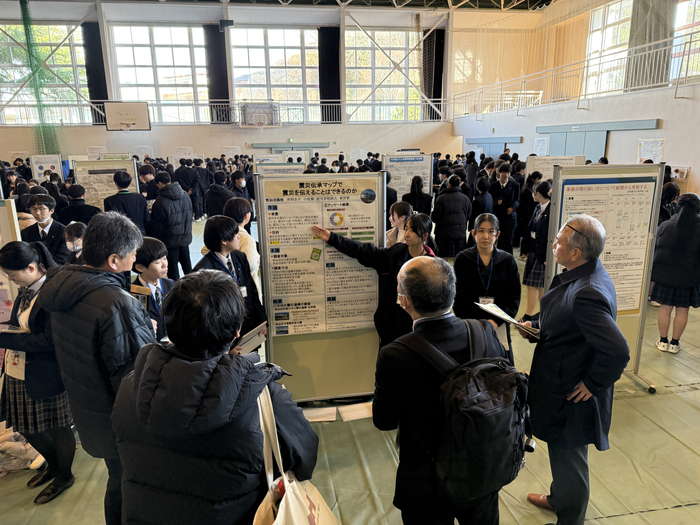 海とともに研究でつながる「大学フィールドワーク」として、12月には大学研究機関から解決アプローチを探す大学研究の視点を取り入れた。今後の自走に向けた経費削減も見越し、仙台方面は宮城大学食産学群のみ訪問し、東北大学災害科学国際研究所、宮城教育大学、東北工業大学とオンライン接続して研究方針に関する助言を受けた。ここでは、フィールドワーク実施の候補日を複数日設定することで、訪問先を増やし、先述の大学と地元企業を合わせて34機関を訪問することができた。その成果について、校内で、1学年「地域社会研究」52テーマ、2学年「課題研究」182テーマで探究発表を行った。外部交流で、近隣の石巻好文館高校、石巻高校、仙台第三高校に加え、古川黎明高校のSSH研究「黎明サイエンスフェスタ」、多賀城高校の震災行事「3.11 メモリアル"Re-Dit"ミーティング」に参加して、海洋に関するの探究活動を通じて、多くの大人と関わり、同世代の仲間と夢を語り合う場を生徒に提供することができた。