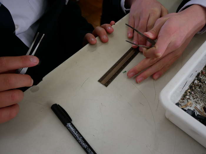 (1)九十九里町にある片貝海岸において、砂浜にある海洋ごみがどの程度あるのか、また、どのような海洋ごみの種類があるのかを調査した。調査当日は、感染症の拡大のため現地調査ができなかったが、理科教諭で海岸にある砂を採取し学校に持ち帰り、その砂の中に含まれる海洋ごみ(マイクロプラスチック等)を調査した。海洋ごみは、種類や大きさに分けて分別して採取した。この活動により、海洋ごみの多さや種類の多様さ、海外のごみの存在等に気づく生徒が多くいた。