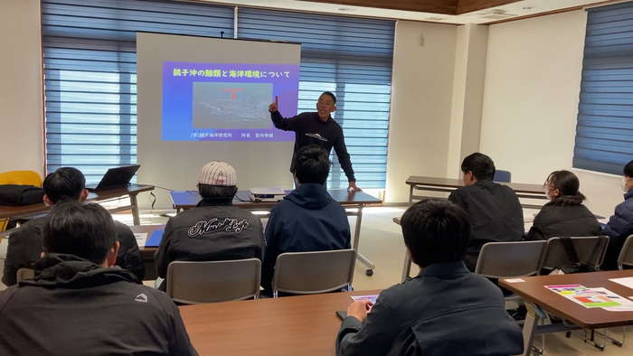 銚子マリーナの施設見学、利用状況などの説明による地域海洋環境についての理解。「イルカウォッチング船フリッパー号」乗船による海洋生物の観察及び洋上風力発電試験機の見学による海洋利用の現状把握。イルカウォッチング後の講話「銚子沖の鯨類と海洋環境について」における海洋哺乳類の現状についての理解。