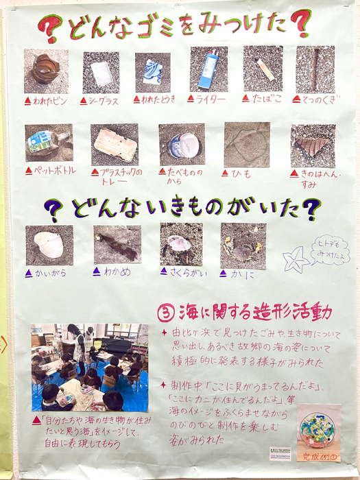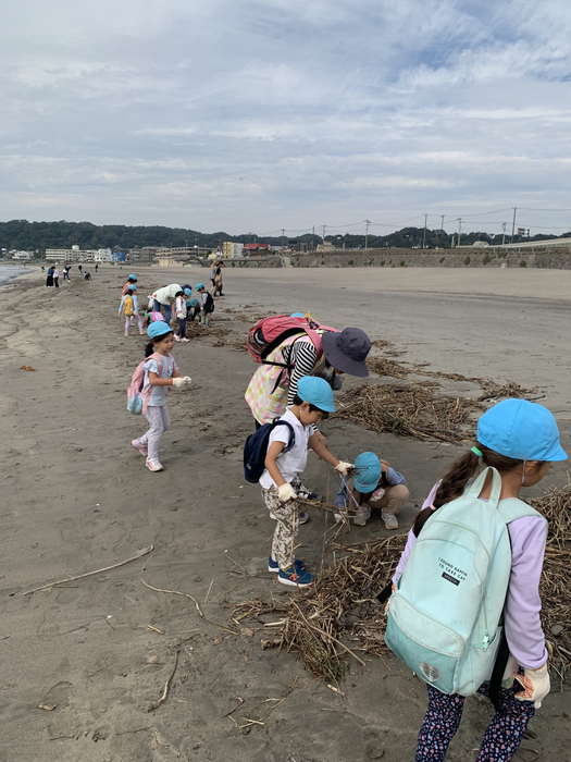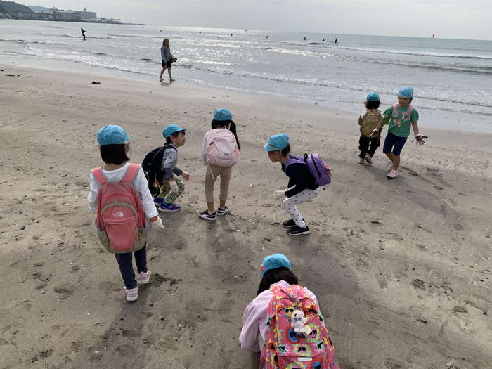 概要:子どもたちは軍手をつけ、大人はトングやゴミ袋などを用意し、徒歩で海岸へ向かった。実際に海岸を歩きながらビーチクリーン活動をおこなった。清掃活動と同時に、海で見つけた生き物を観察して写真を撮った。清掃後は、見つけたゴミを分別し写真に記録しながら、「この海の生き物たちは、海のゴミが増えたらどうなるかな?」と子ども達に考えてもらった。清掃後は、2018年に由比ガ浜にシロナガスクジラの赤ちゃんが打ち上げられ、胃の中からプラスチックゴミが発見されたことを写真で伝えた。そして、由比ヶ浜だけでなく海全体にプラスチックごみがあることを伝えた。その後、講師がゴミや海で見つけた生物の写真及びこれまでの活動の様子を園内に掲示し、後に子どもたちが保育園の図鑑などでも調べ学びを深められるようにした。